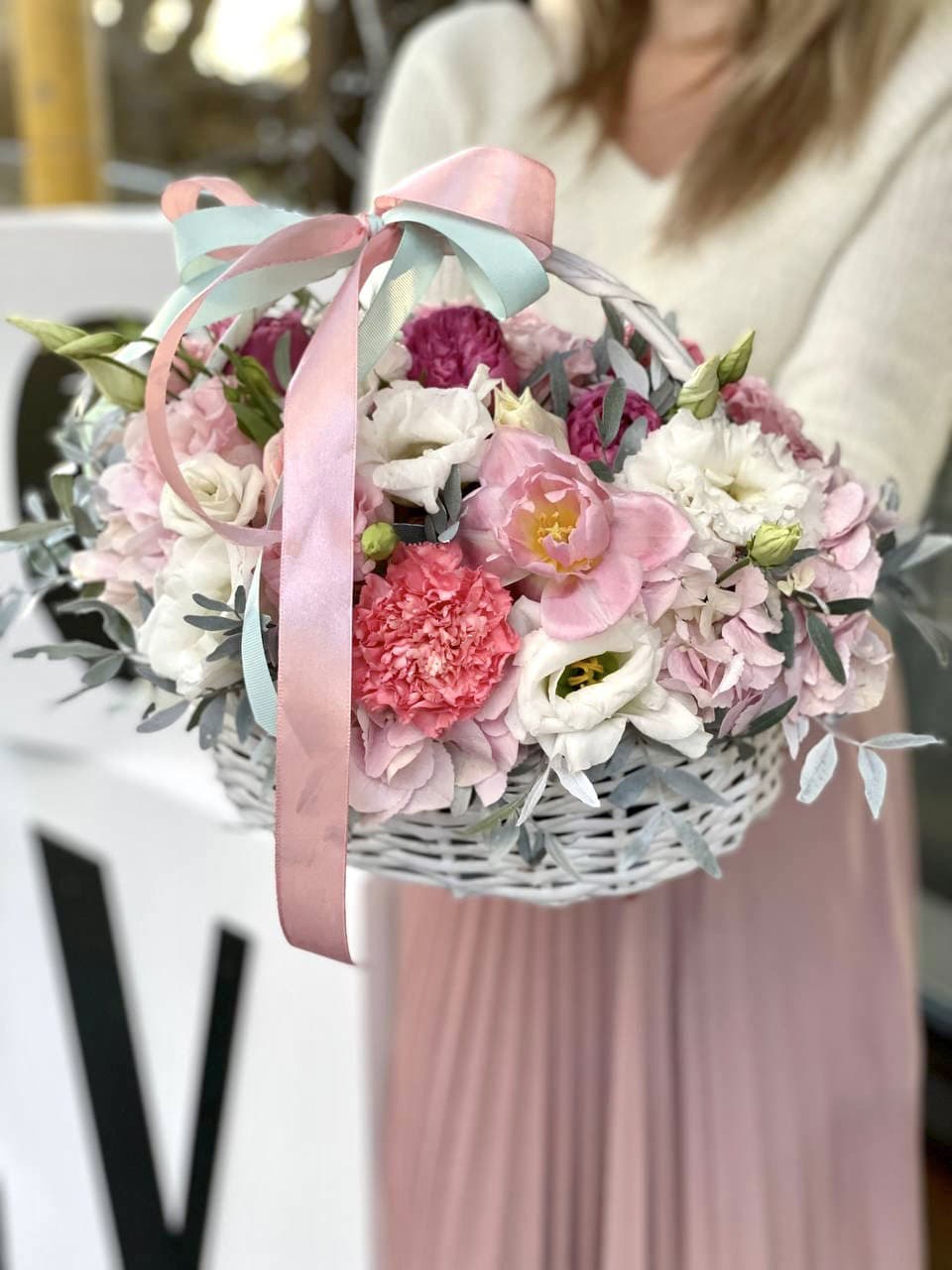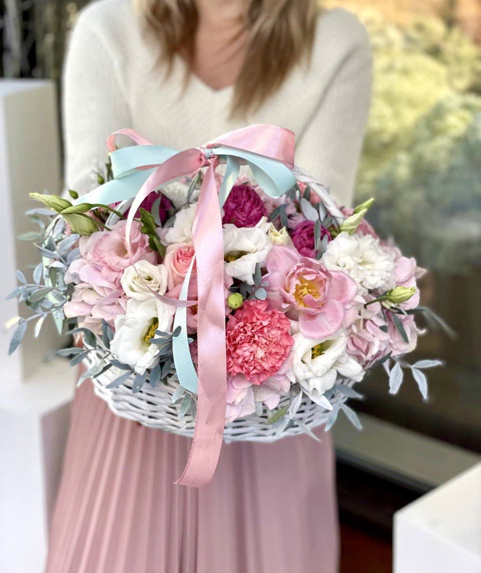 Композиция в плетёной корзине собрана из роз, эустомы, гортензии и диантуса с добавлением воздушного мисти баблс. Каждый цветок находит своё место в общем ритме, создавая гармоничную картину. Готовое решение для дома или в подарок близким.