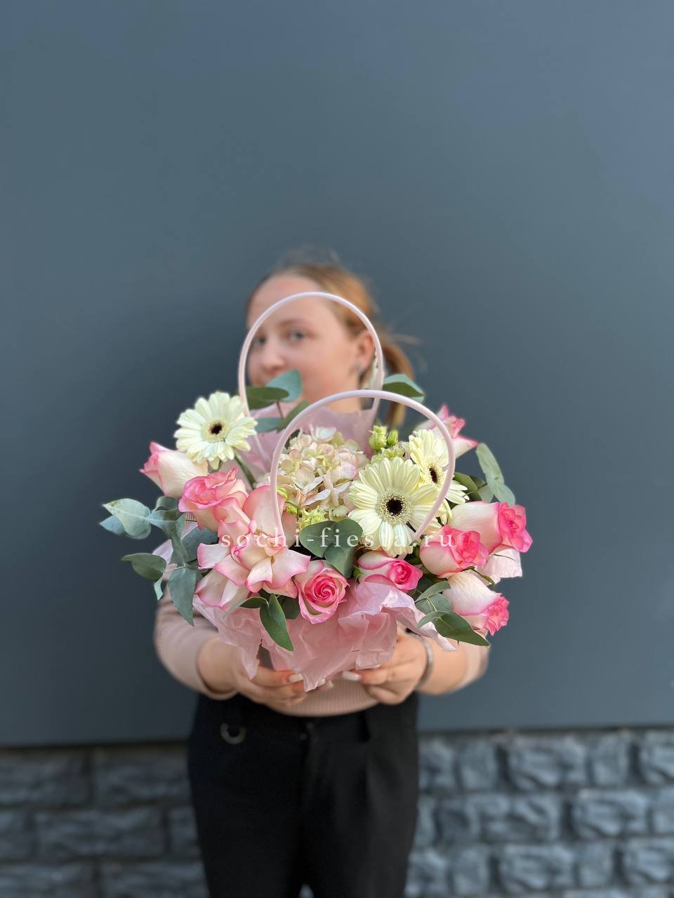 гортензия, бомбастик, эустома, розы, ранункулюсы (аналог вне сезона), дельфиниум (аналог вне сезона), лента, корзина D30.