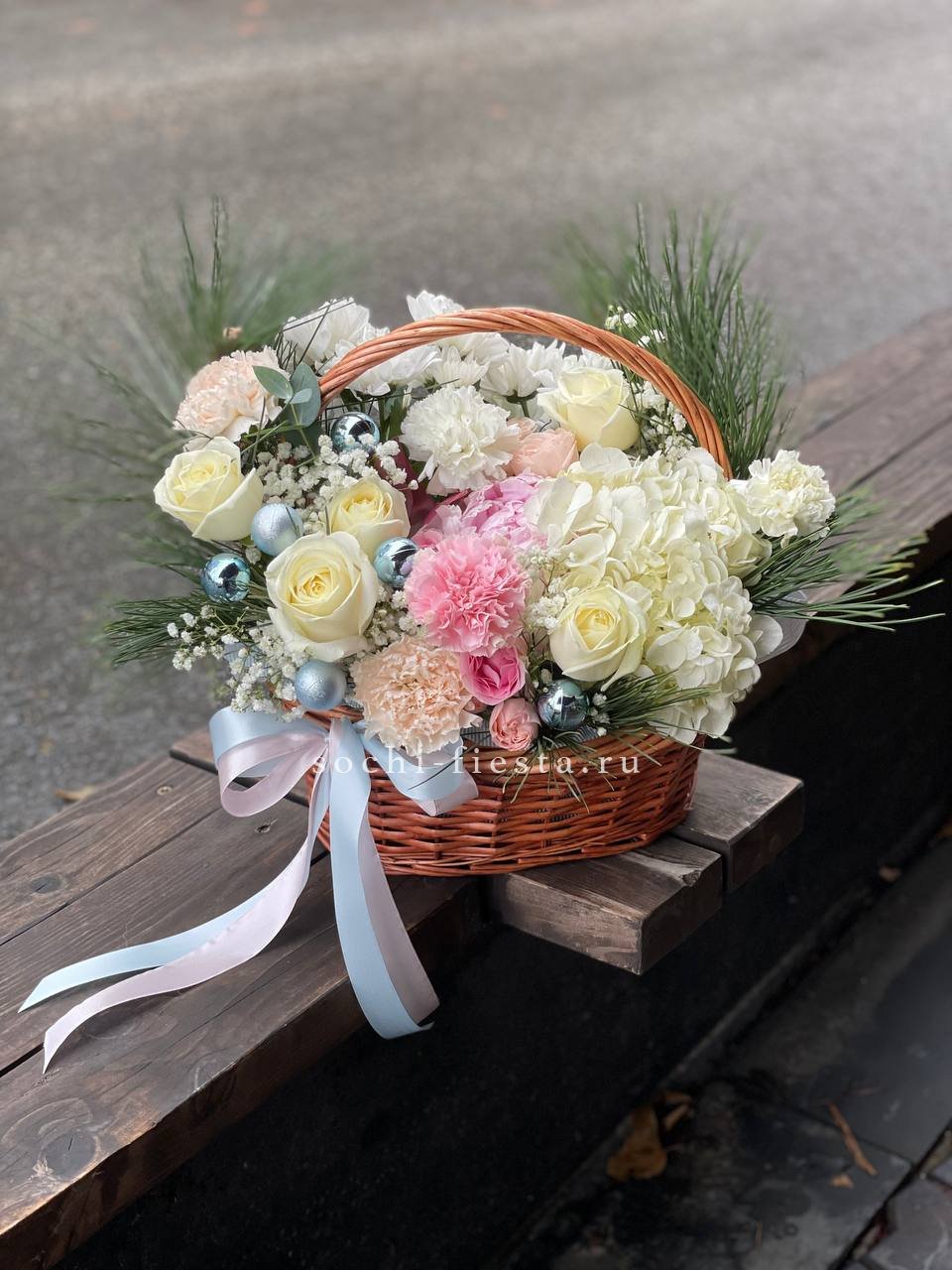 Праздничная корзина сочетает пышную гортензию с бархатистыми розами и яркими хризантемами. Еловые ветви и золотистый бомбастик создают объёмную текстуру, а диантусы и гипсофила добавляют воздушности композиции.