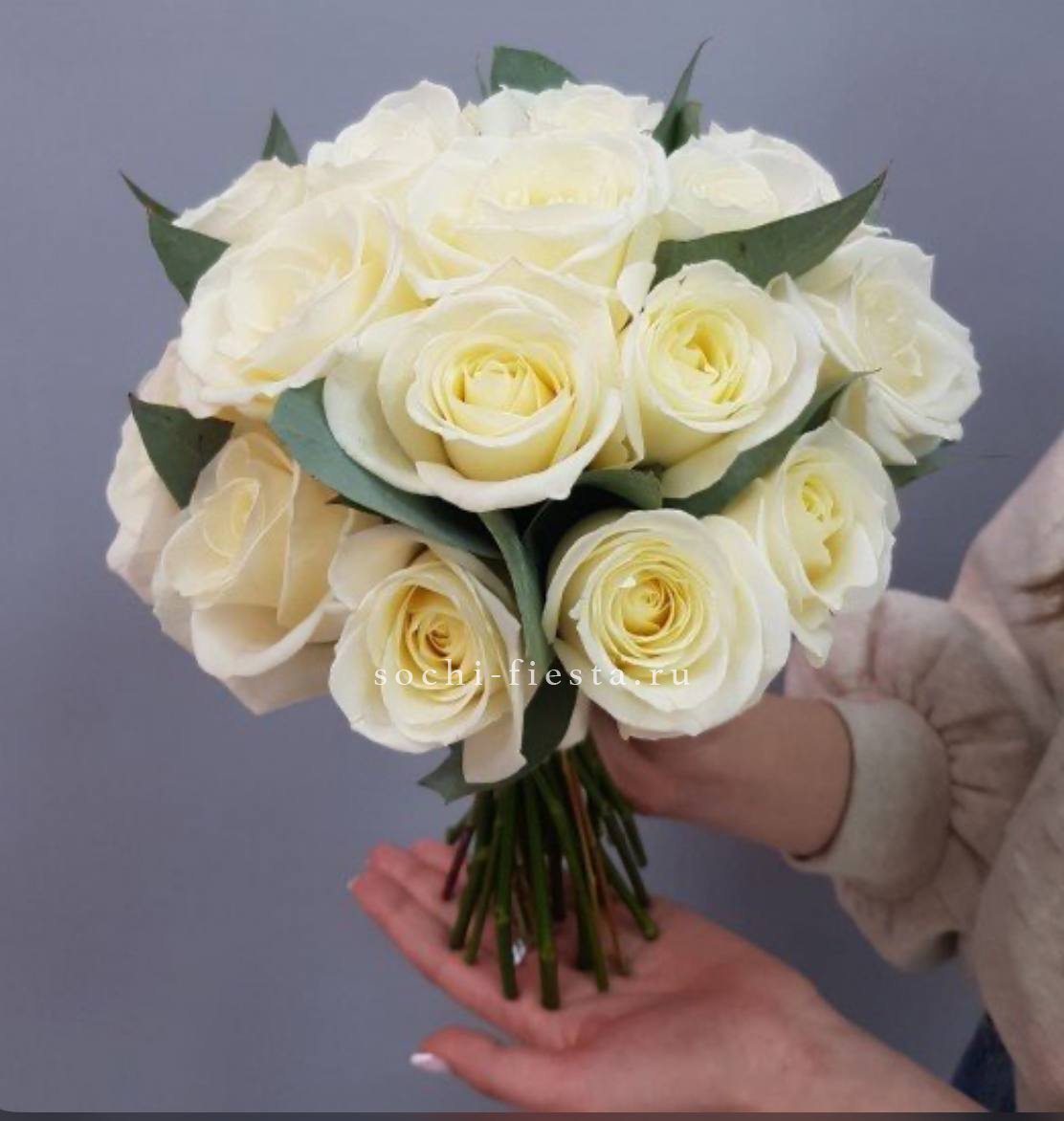 Тридцать одна белая роза в классической круглой сборке. Плотная укладка держит форму весь день, а атласная лента фиксирует стебли без дополнительного декора.