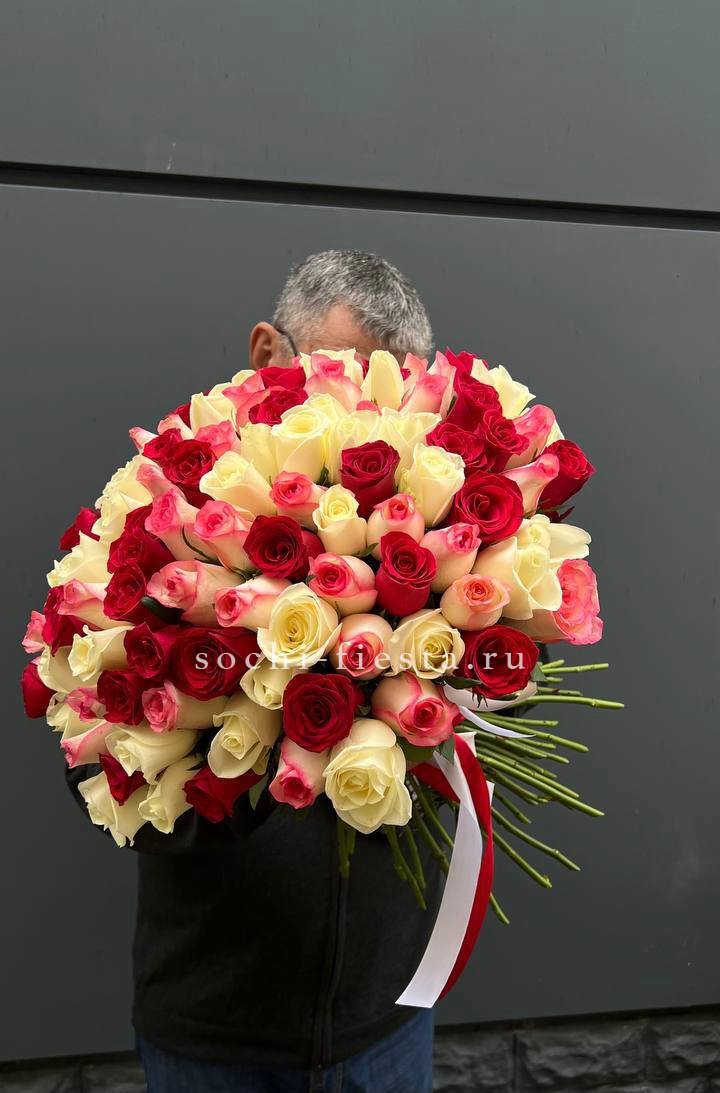 Длинные стебли и крупные бутоны в палитре микс создают букет с графичным силуэтом. Сто одна роза выстраивается в плотную композицию с выразительной вертикалью.