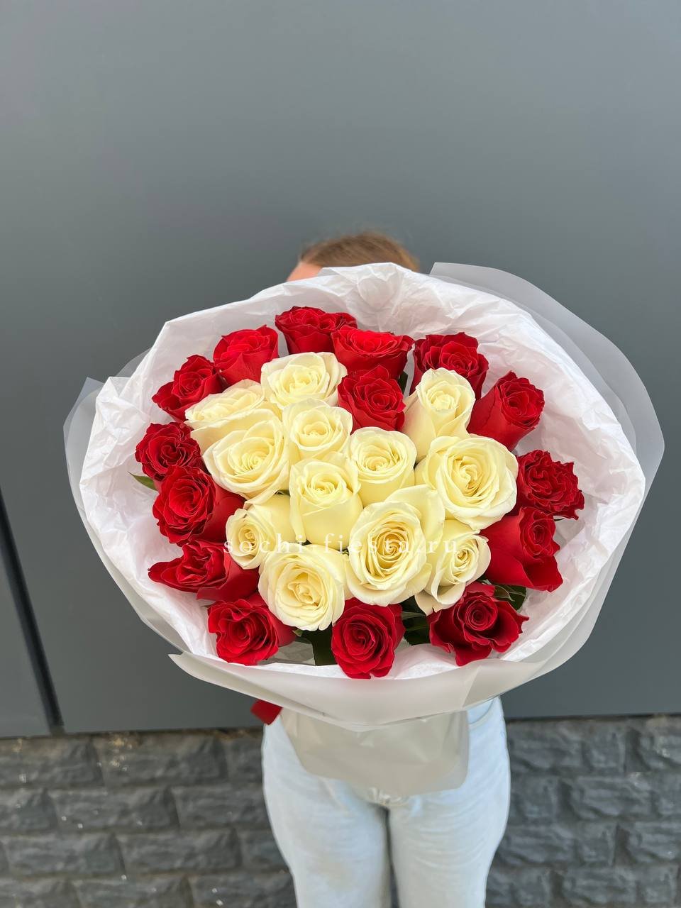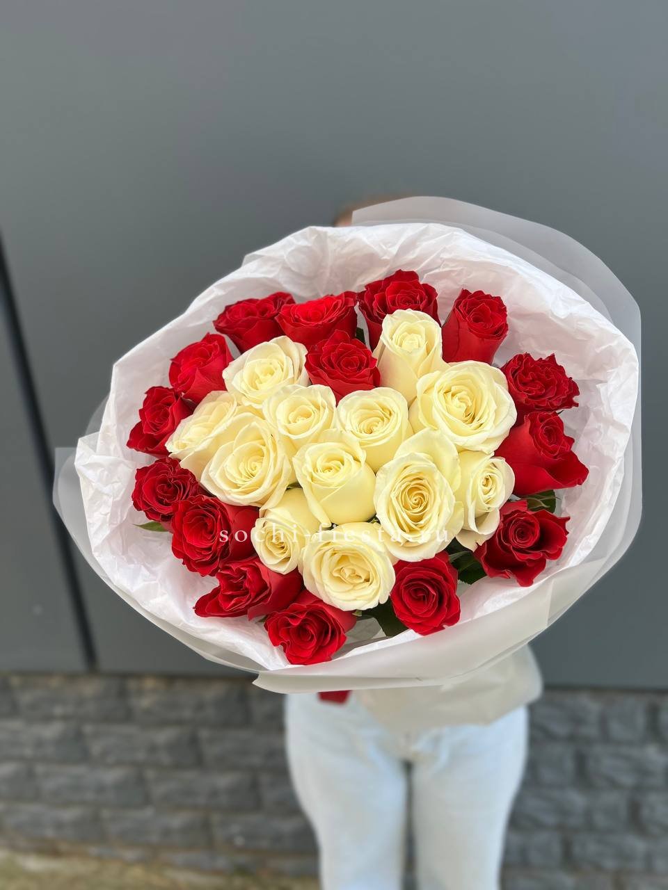 Белые и красные розы переплетаются в динамичной игре света и тени. Двадцать семь бутонов создают живописный рисунок, где каждый цвет усиливает звучание другого без лишних слов.