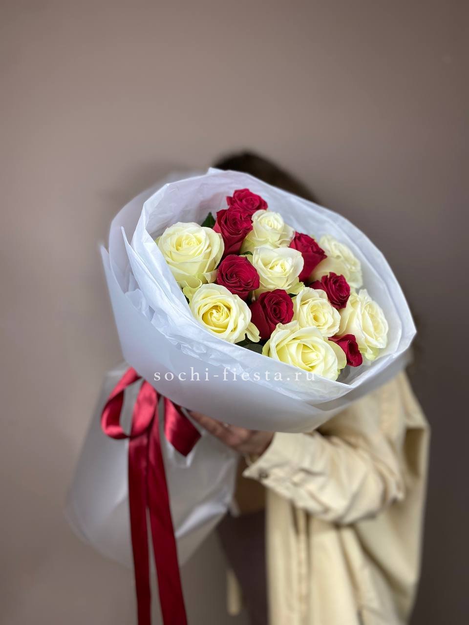 Красный и белый чередуются в свободном ритме, образуя живую композицию. Пятьдесят пять бутонов создают объёмное цветовое полотно, где каждый оттенок усиливает звучание другого.