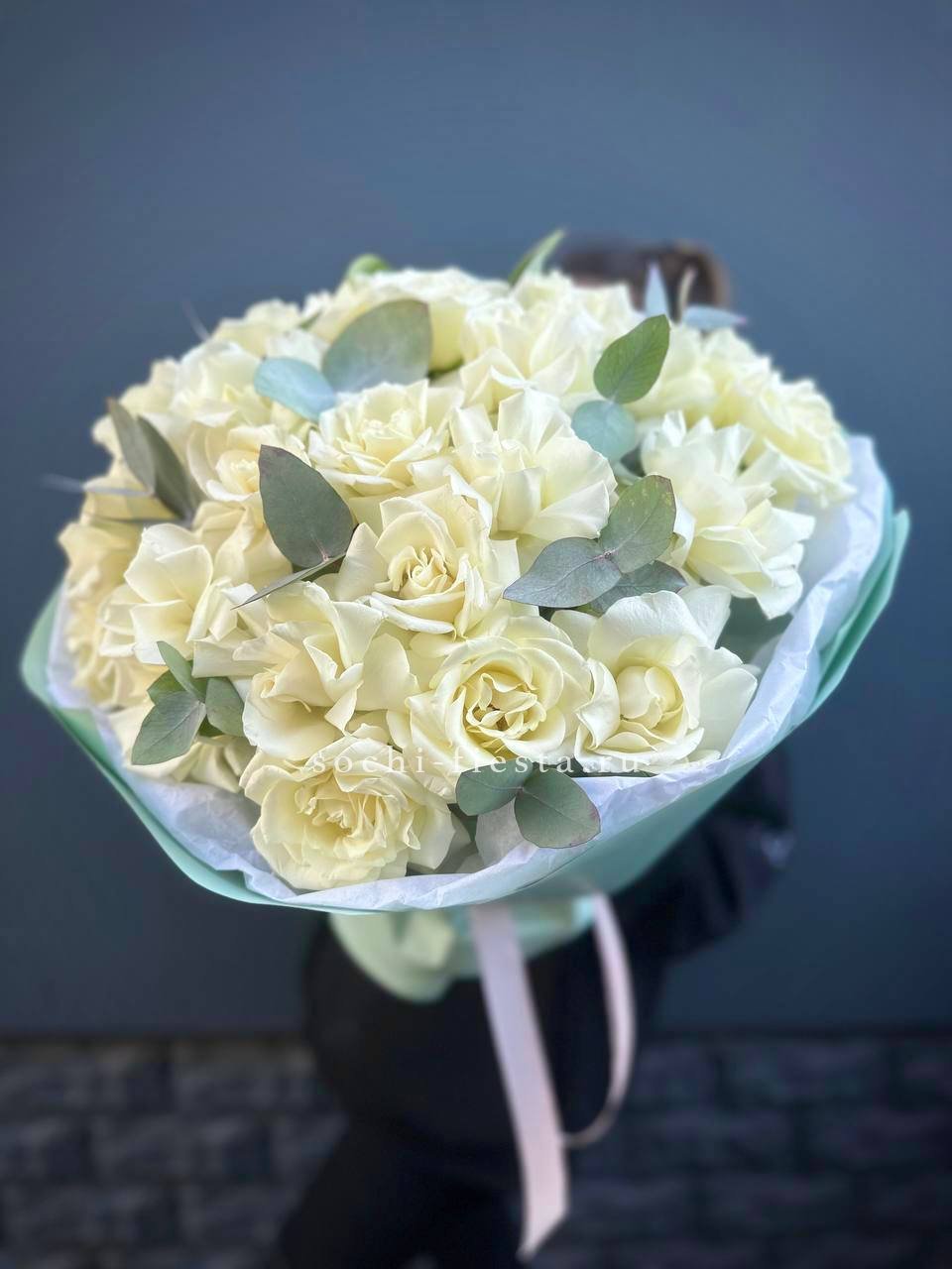 Вывернутые лепестки французских роз Notte Bianca раскрываются широко и создают объемную текстуру. Двадцать пять бутонов в окружении эвкалипта выглядят современно и графично.