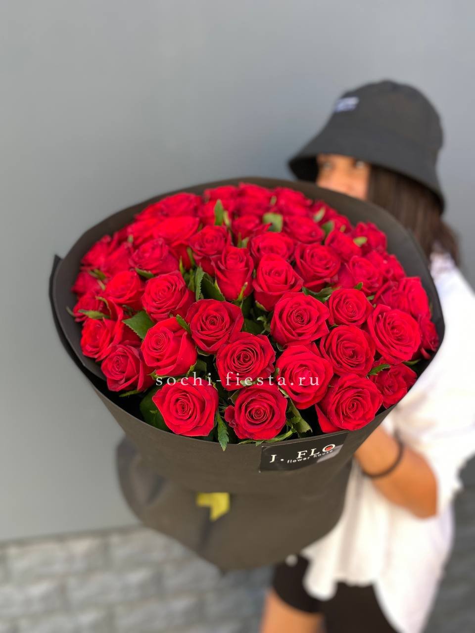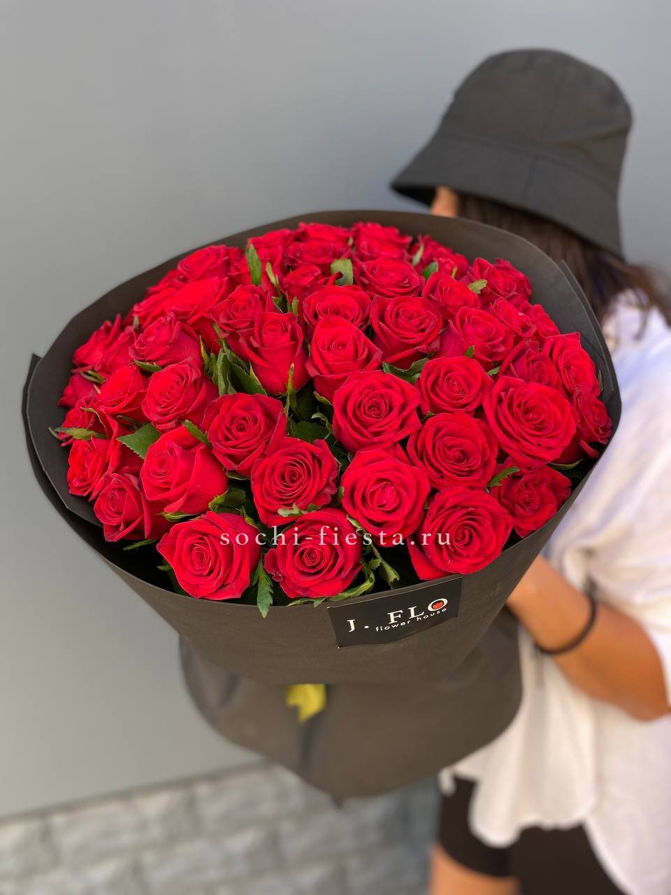51 красная роза, лента, черный фоамиран или дизайнерская пленка.