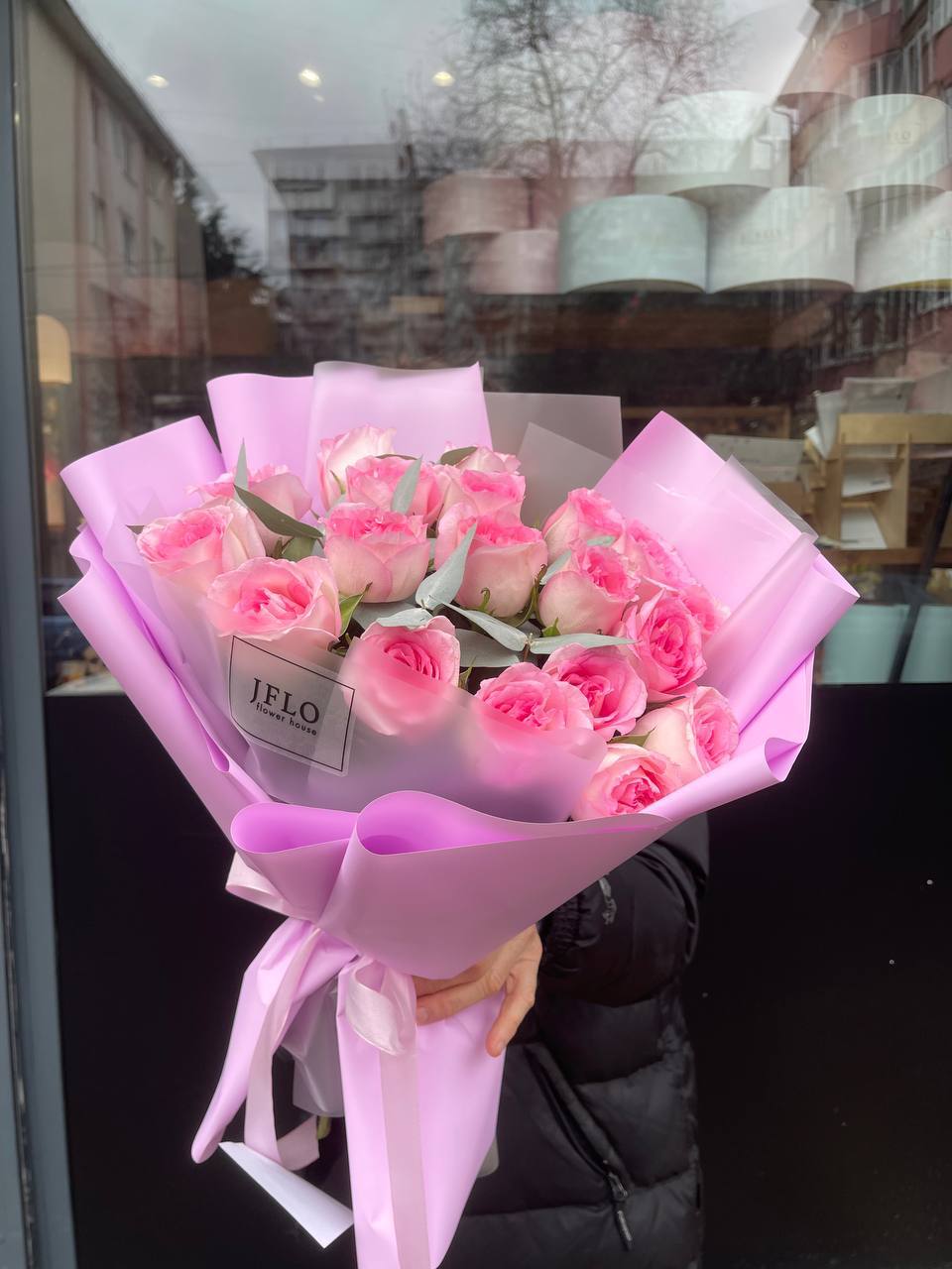 Девятнадцать бутонов раскрываются плавными волнами, создавая объёмную композицию с чёткими линиями. Розовый оттенок переходит от светлого к насыщенному, а эвкалипт добавляет воздушности между соцветиями. Букет держит форму и выглядит самодостаточно.