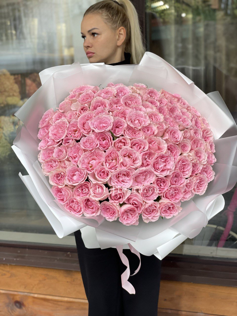 Двадцать пять бутонов с бархатистыми лепестками собраны в округлую форму, которая держит объём и создаёт мягкое розовое облако. Такой букет легко размещается в вазе и сохраняет свежесть долгое время.