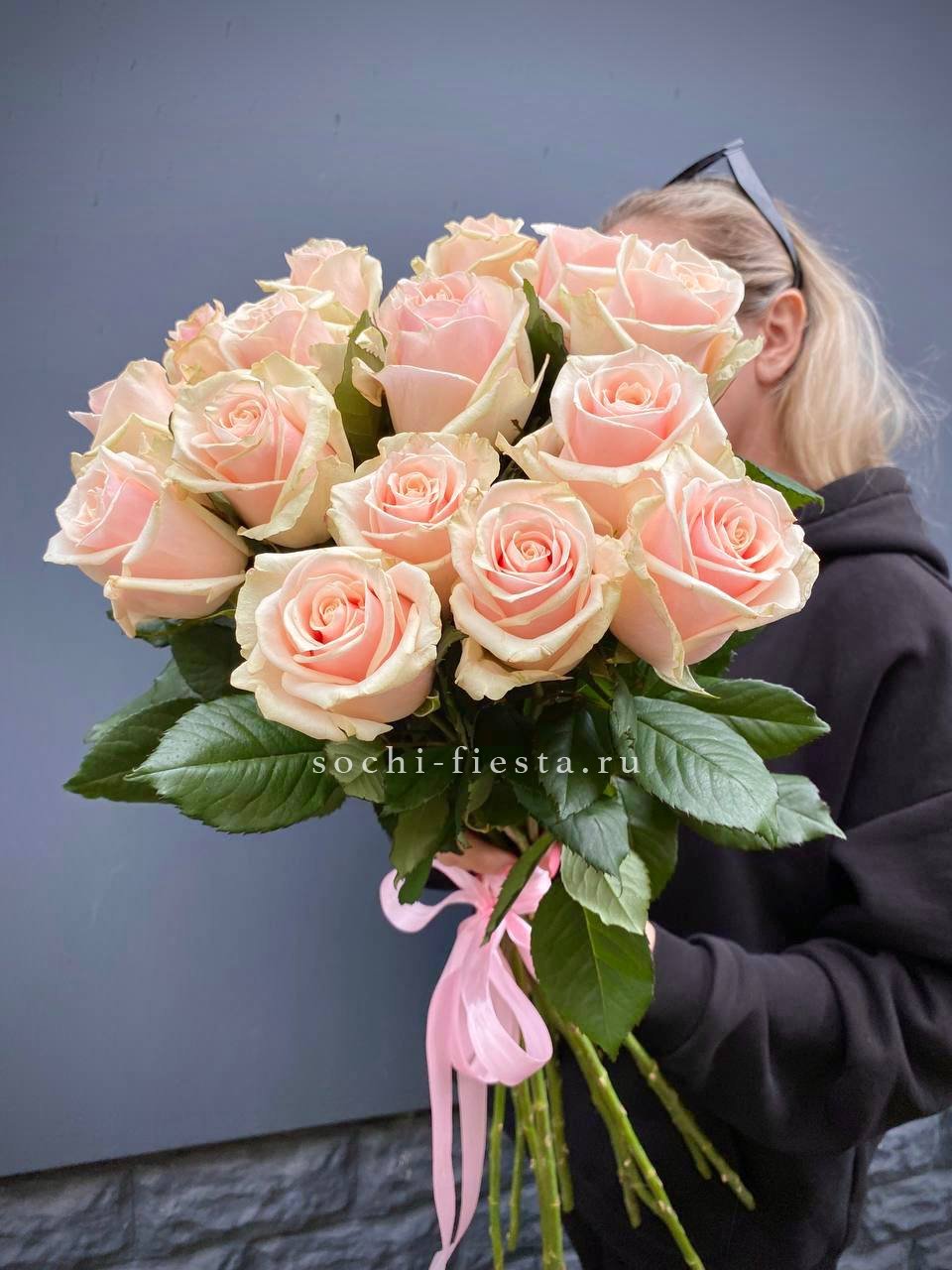 15 высоких кремовых роз, лента, упаковка на выбор.