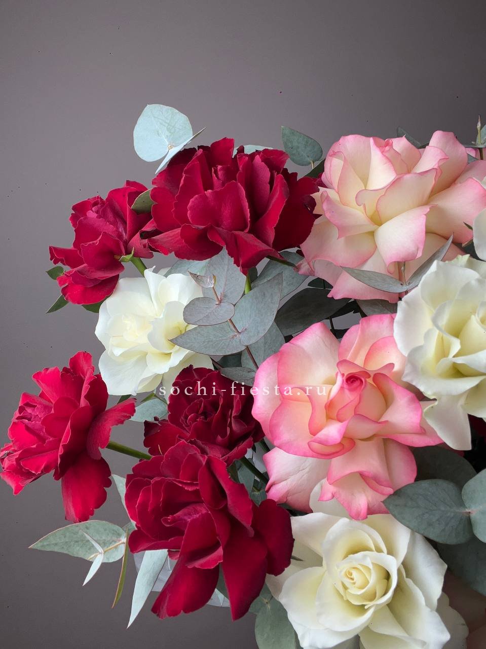 Пять французских роз с вывернутыми лепестками раскрываются широко и создают эффект лёгкой небрежности. Эвкалипт поддерживает форму и добавляет свежести белому цвету.