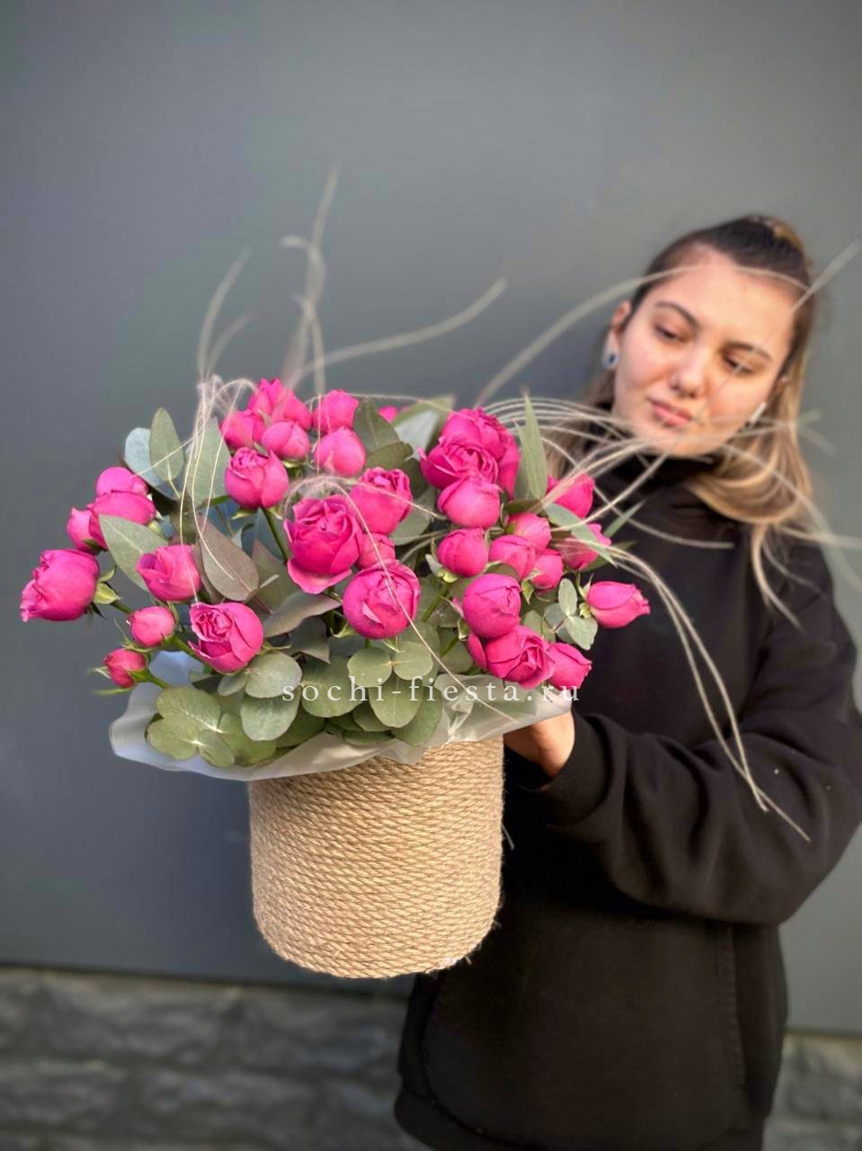 Семь пышных кустовых роз собраны в плотный круг и обрамлены воздушными ветками хамелациума. Бутоны раскрыты почти полностью, создавая объёмную шапку с мягкими переходами оттенков. Композиция держит форму и выглядит самодостаточно.