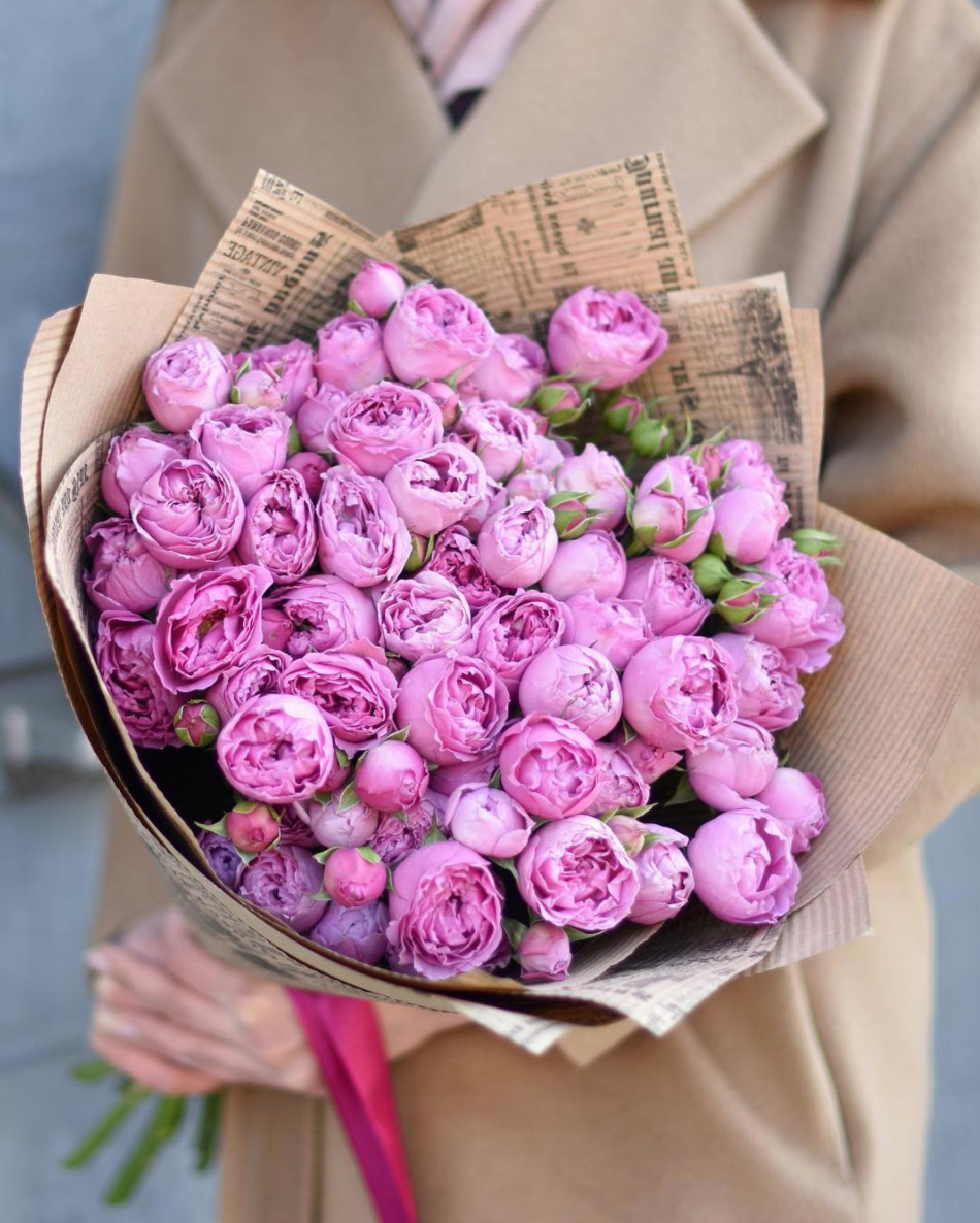 15 пионовидных кустовых роз в сиреневых или розовых оттенках, лента, крафт или другая упаковка на усмотрение заказчика.