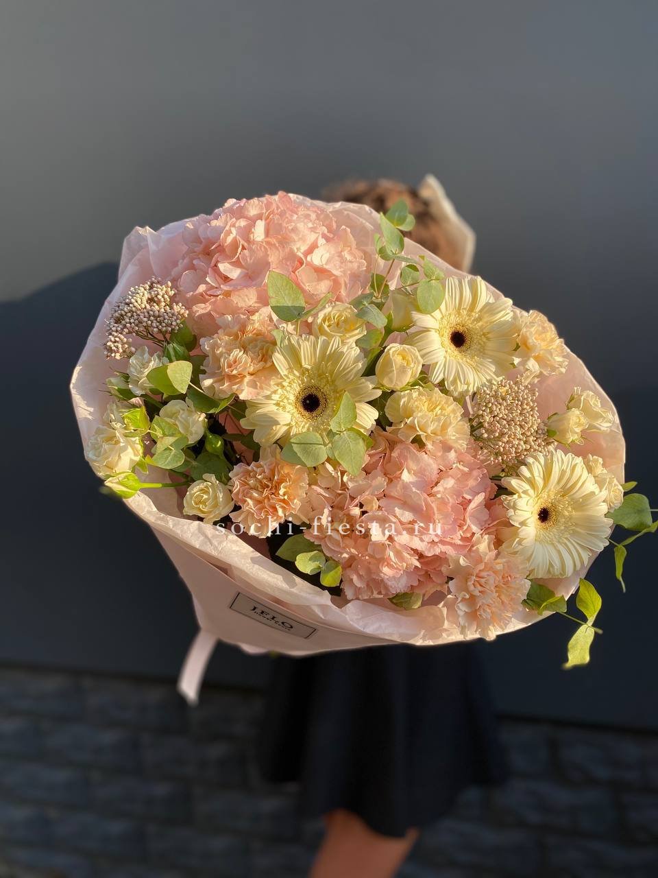 ранункулюсы, гортензия, эвкалипт, авторское оформление.