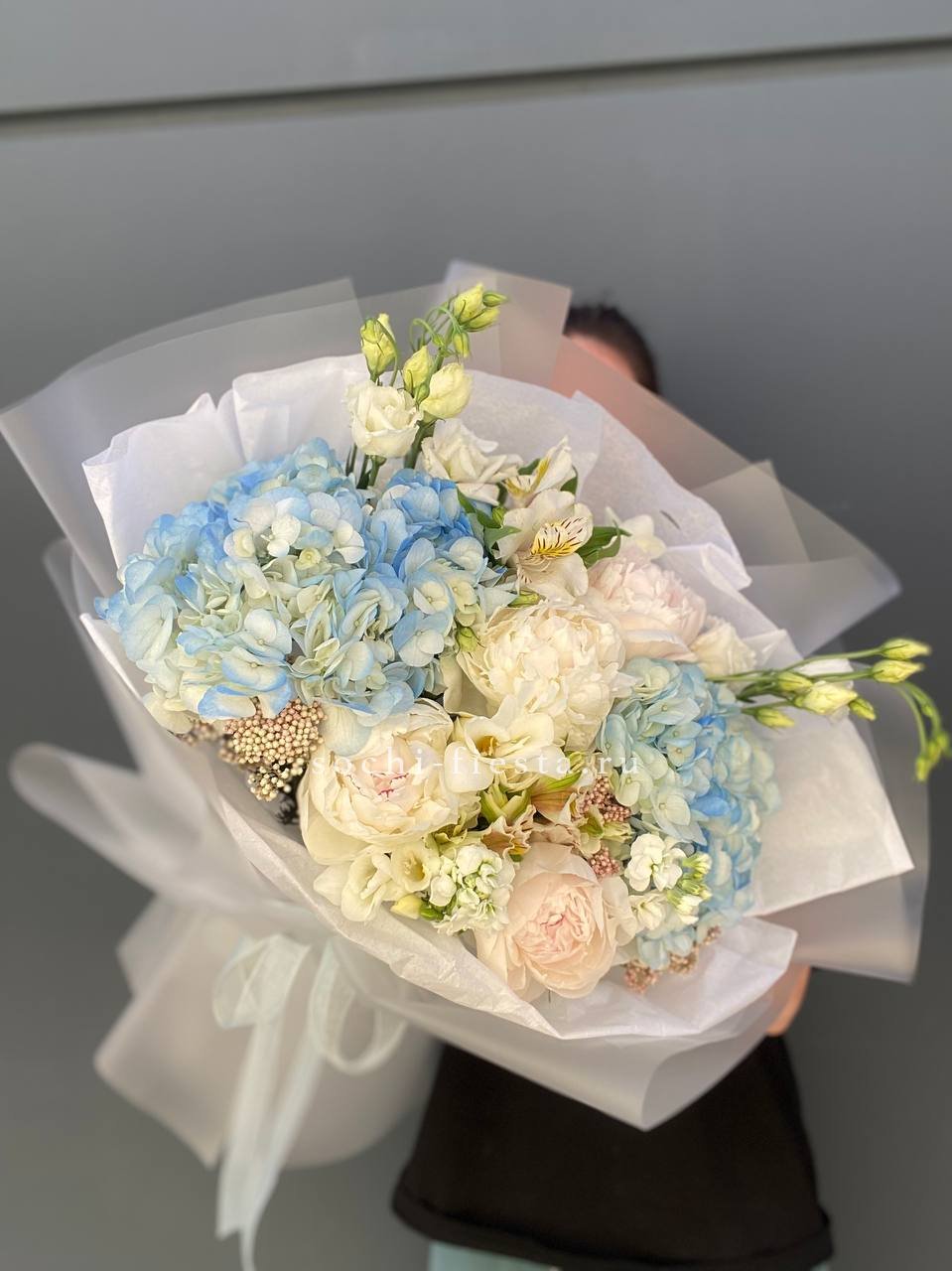 пионы, гортензии, эустома, альстромерии, маттиола, озатамус, лента и дизайнерская пленка.