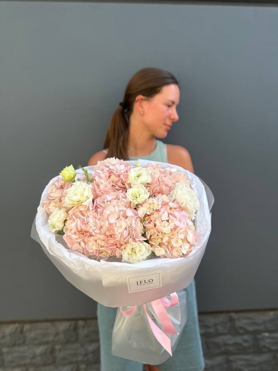 Пастельная гамма с лёгким касанием зимнего воздуха. Кустовые розы и диантус окружены воздушным ковылём, создавая мягкую текстуру с едва уловимой графикой. Гортензия добавляет объём, не перегружая силуэт.