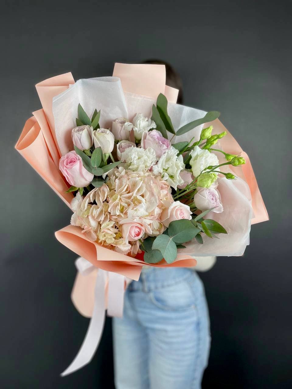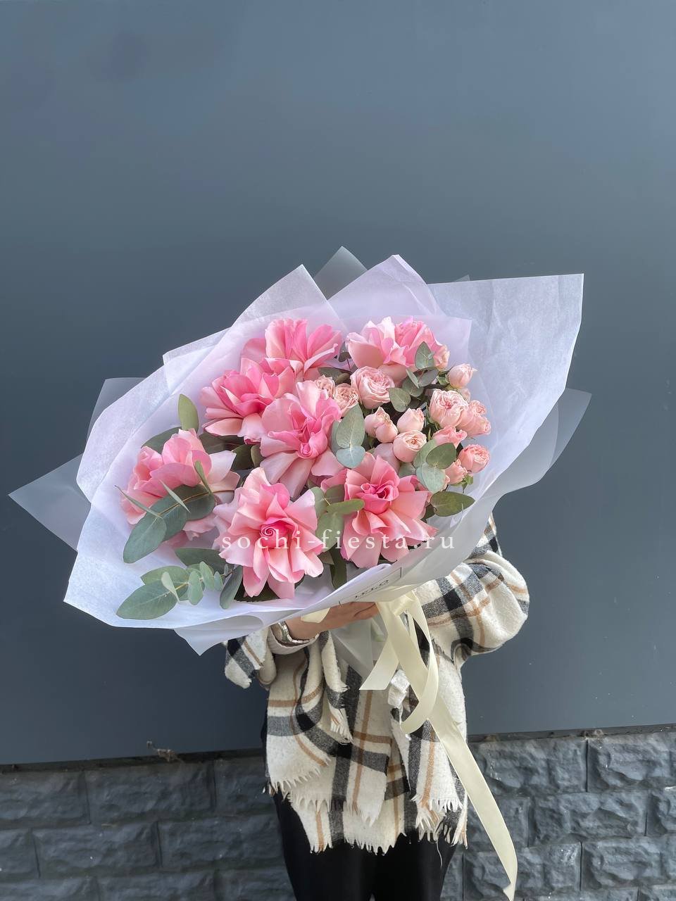 Розовые розы, пионовидная кустовая роза, эвкалипт,  лента, авторская упаковка.