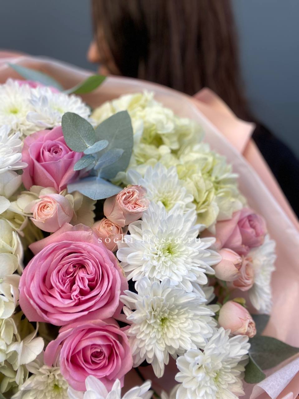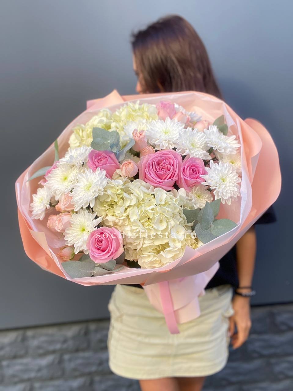 Крупные соцветия гортензии задают основной объем, а эустома и диантус разбивают плотность воздушными бутонами. Мисти баблс и озотамус рассыпаются между цветами, добавляя движение и легкость всей композиции.