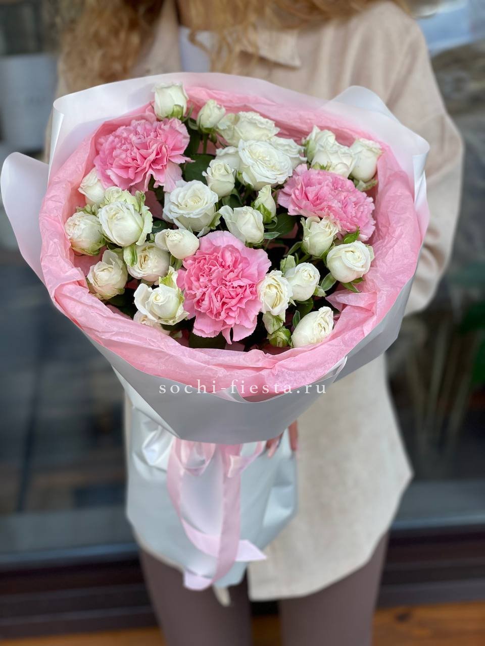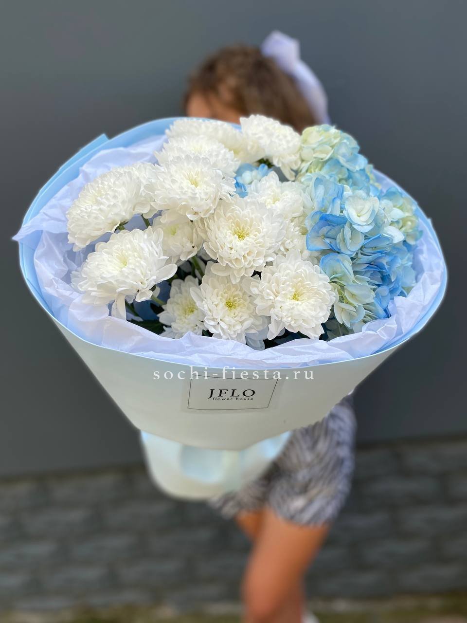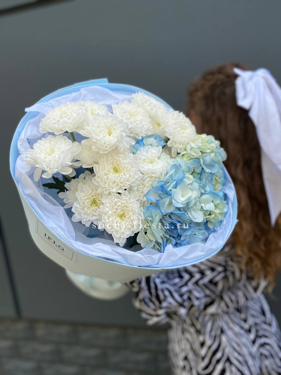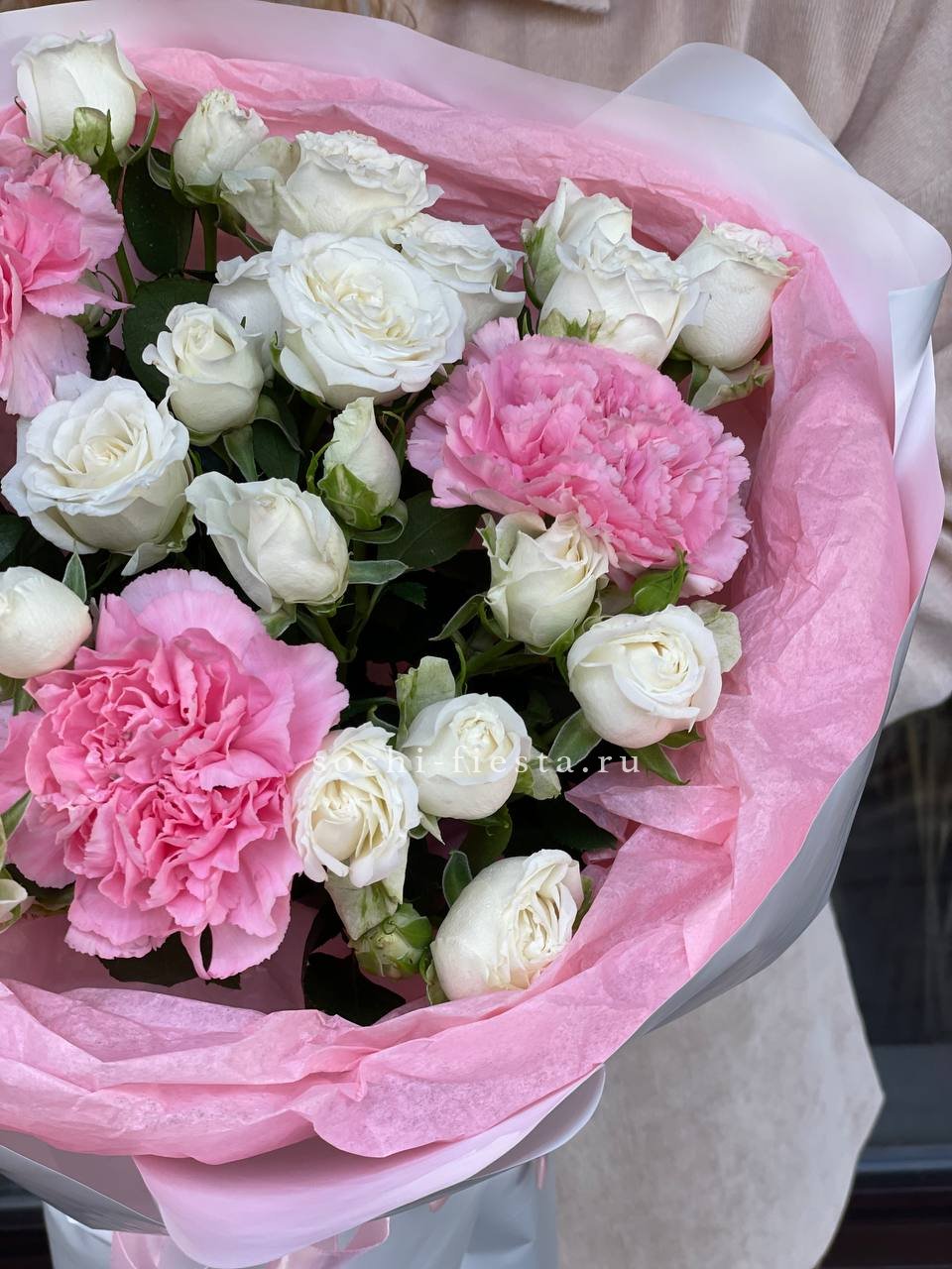 гортензия, роза белая, диантус лента, дизайнерская пленка.