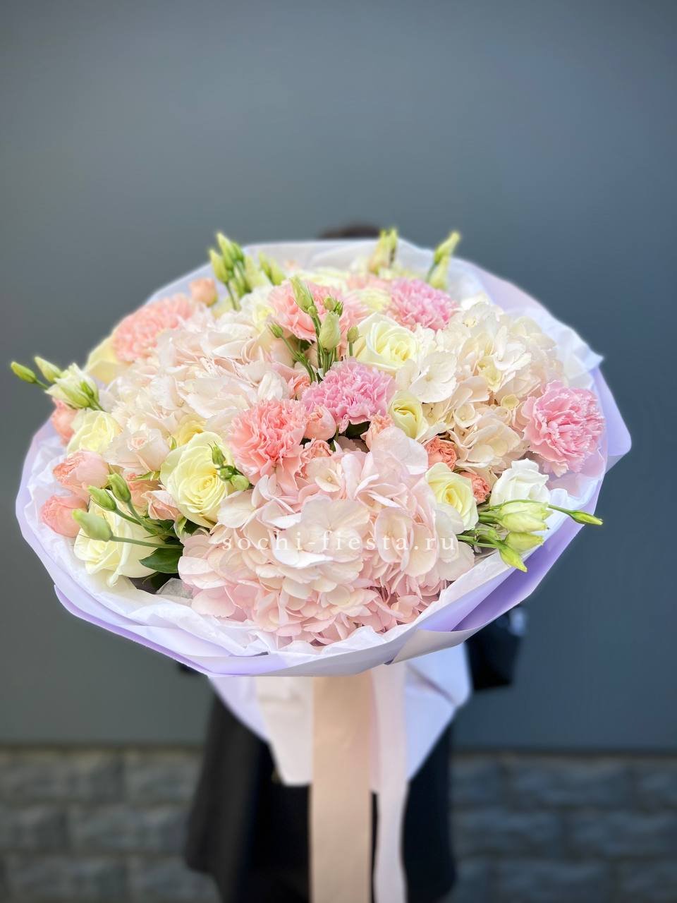 гортензия, хризантема, хамелациум, гербера, мисти баблс, диантус, пленка.