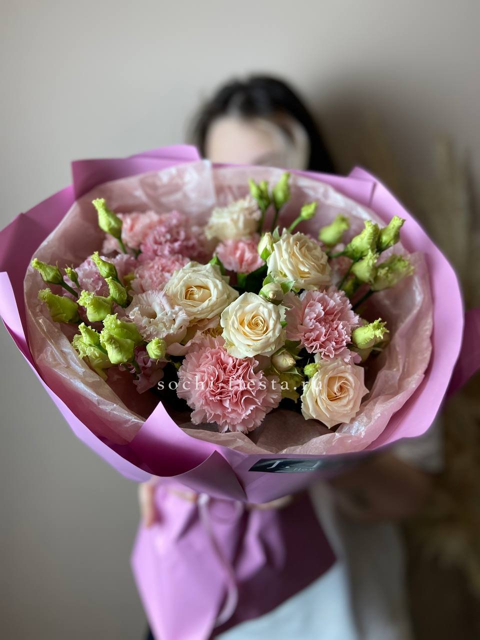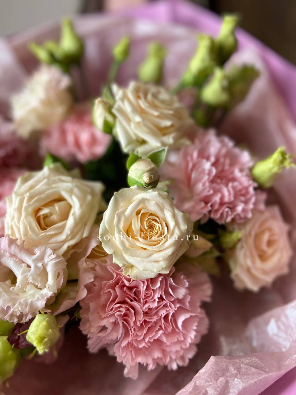 диантус, розы, бомбастик, эвкалипт, упаковка.