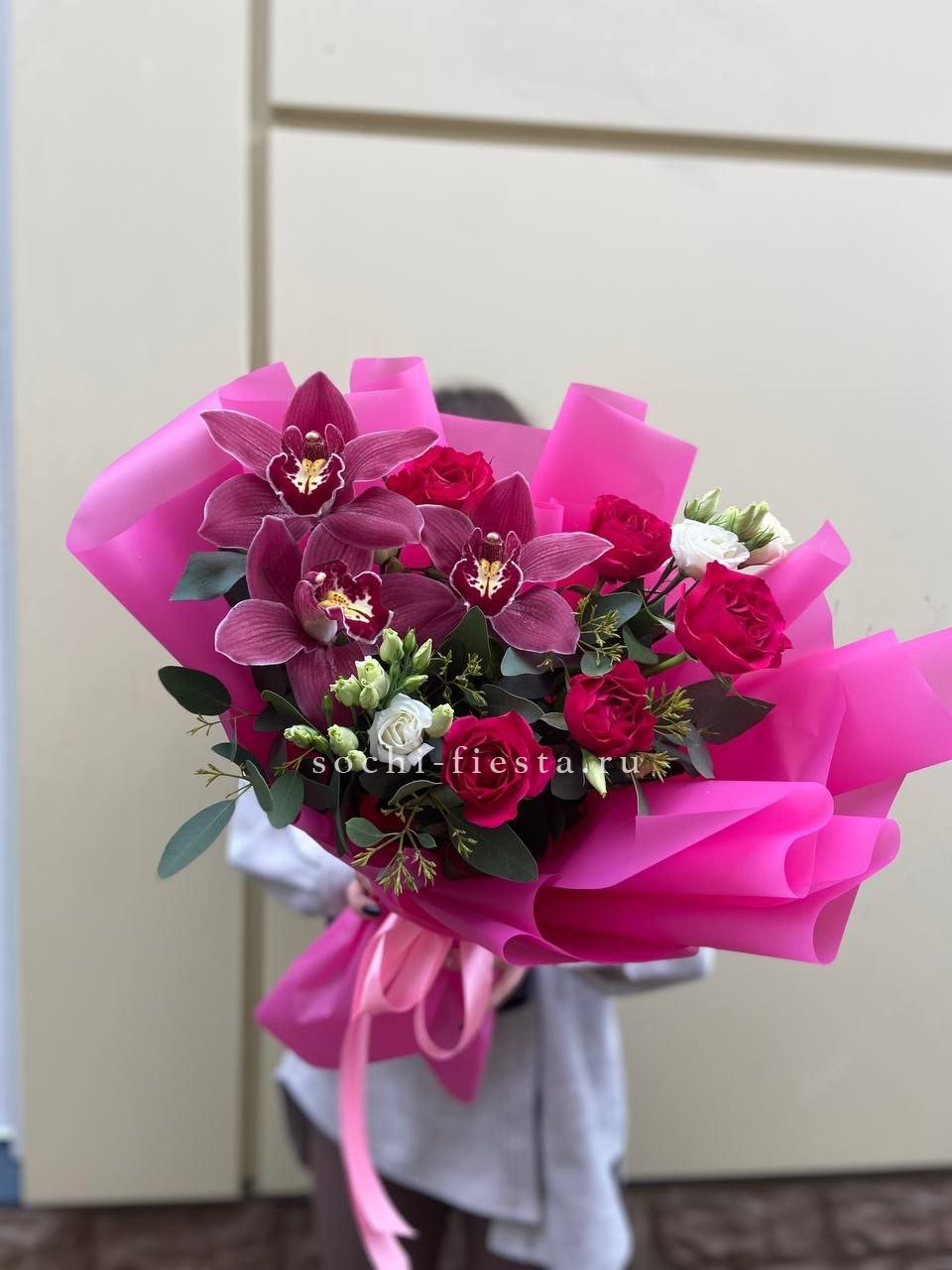 роза, орхидея цимбидиум(или эквивалент),эустома,  эвкалипт, лента, дизайнерская упаковка.