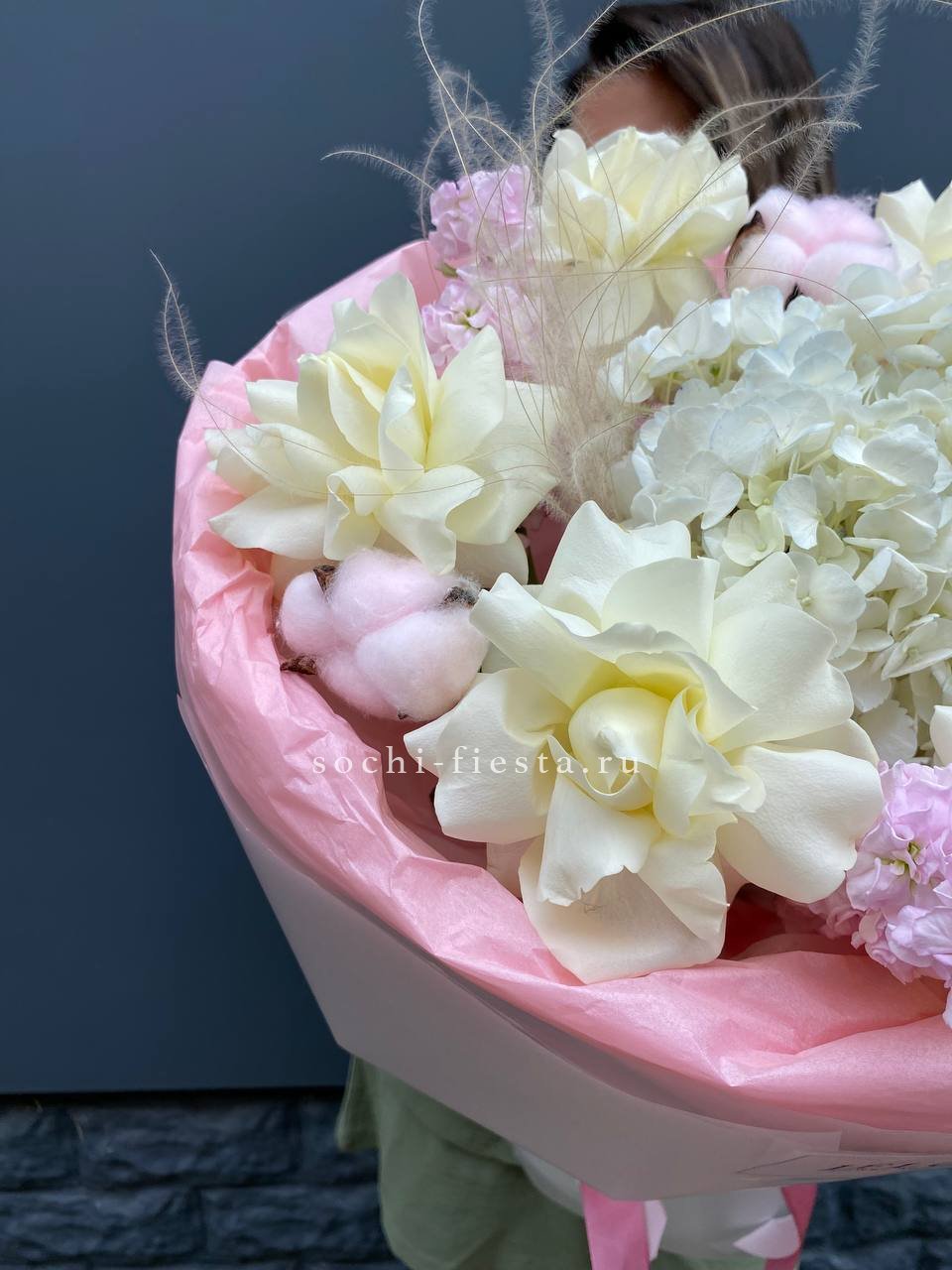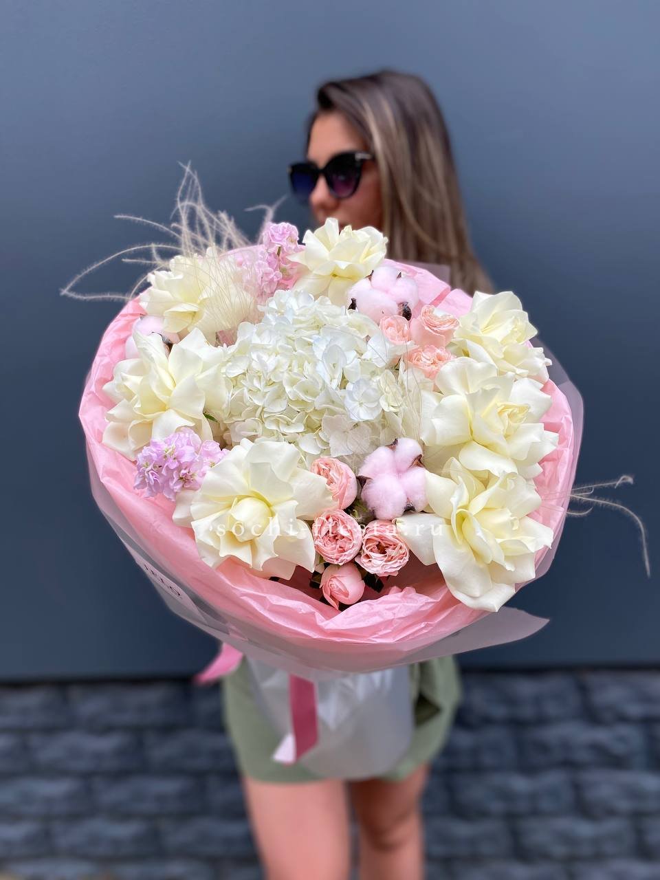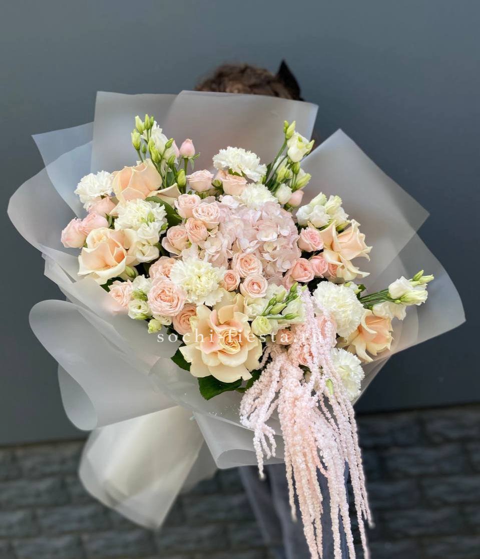 кустовые розы, гортензии, французские розы, диантусы, эустомы, лента и дизайнерская пленка.