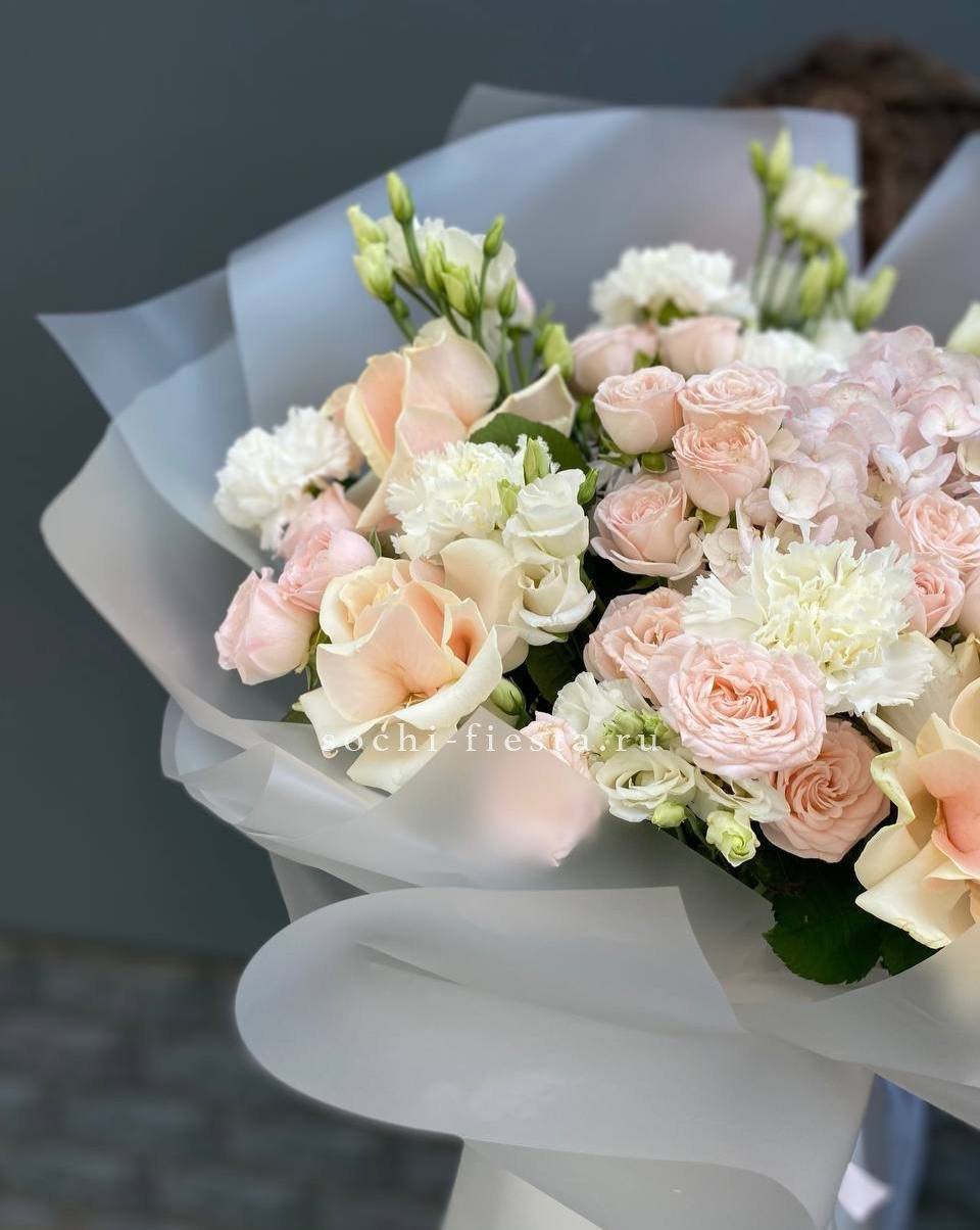 Монохромная палитра с многослойной структурой. Французские розы и эустомы чередуются с кустовыми бутонами, гортензии заполняют объём, а диантусы создают точечные акценты. Букет выглядит цельно и графично.