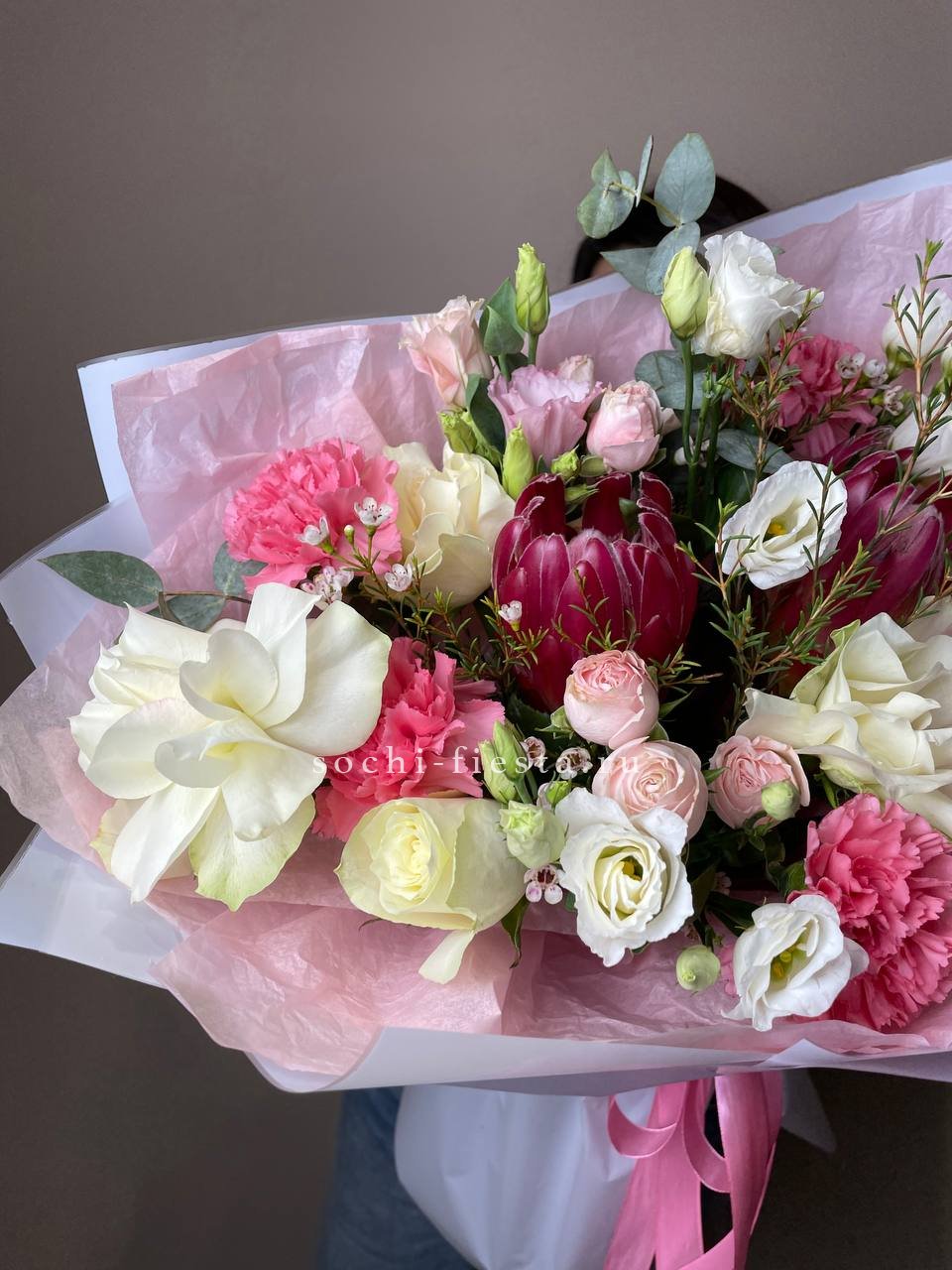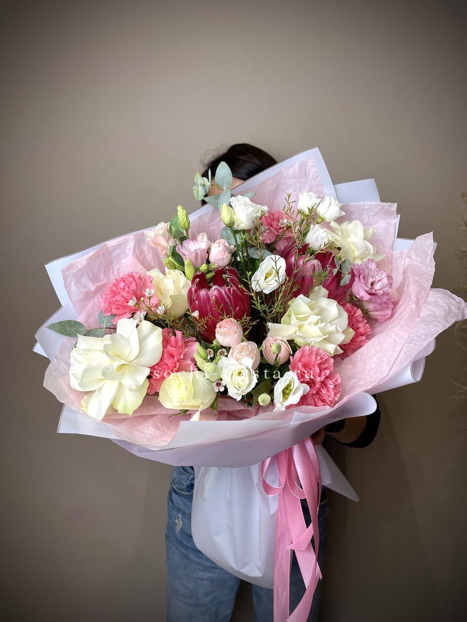 Хризантемы и розы переплетаются с диантусом и озотамнусом в букете насыщенных красок. Каждый цветок раскрывается по-своему, наполняя композицию движением и жизнью.
