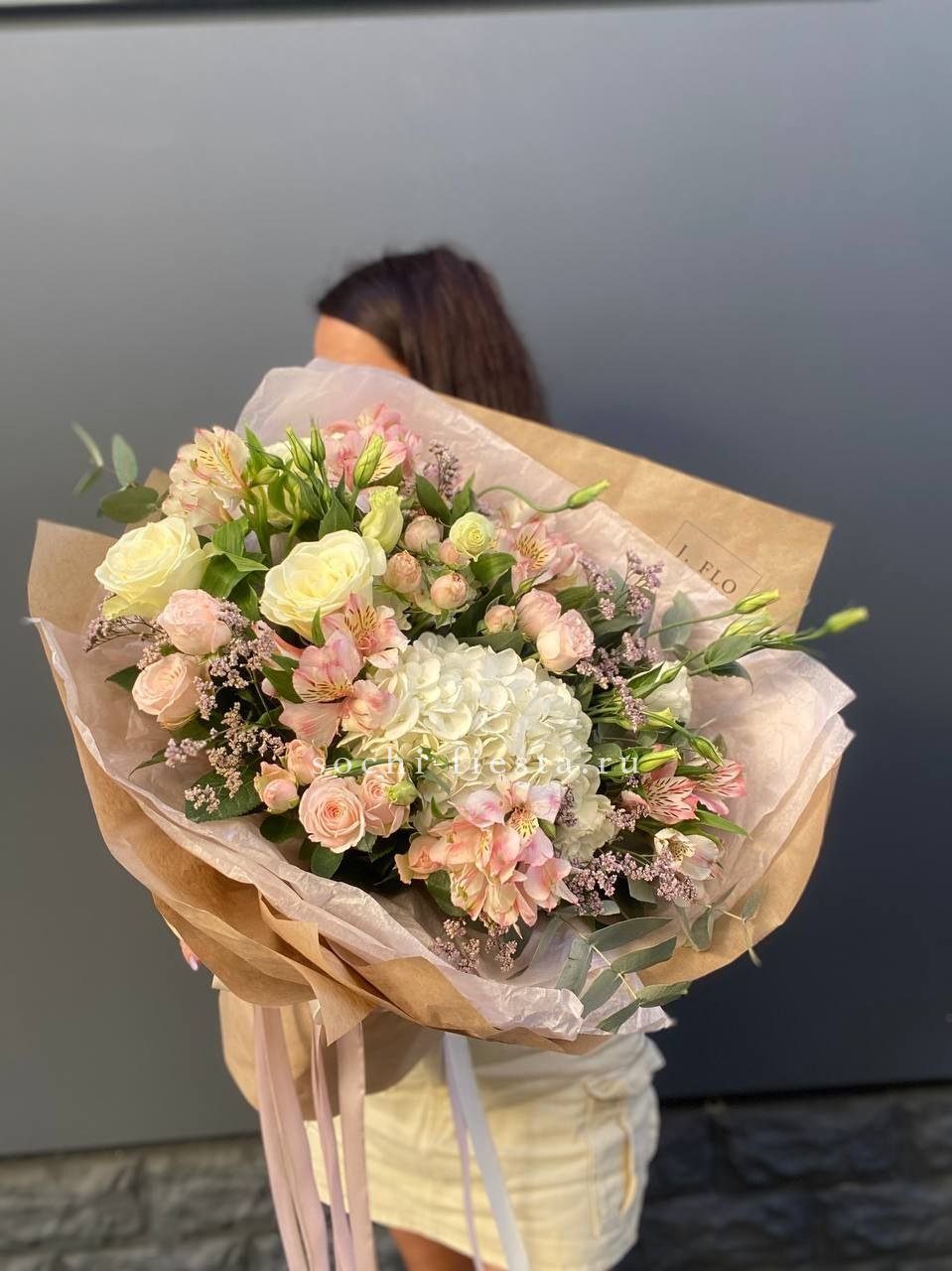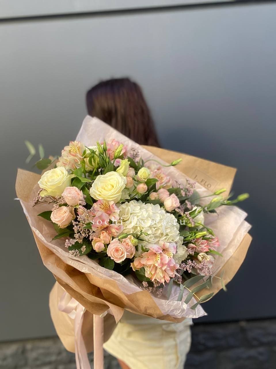 Белоснежные розы и пышные шапки гортензии сплетаются в плотную композицию, где эвкалипт задаёт спокойный ритм. Букет хорошо держит форму и долго сохраняет свежесть в вазе.
