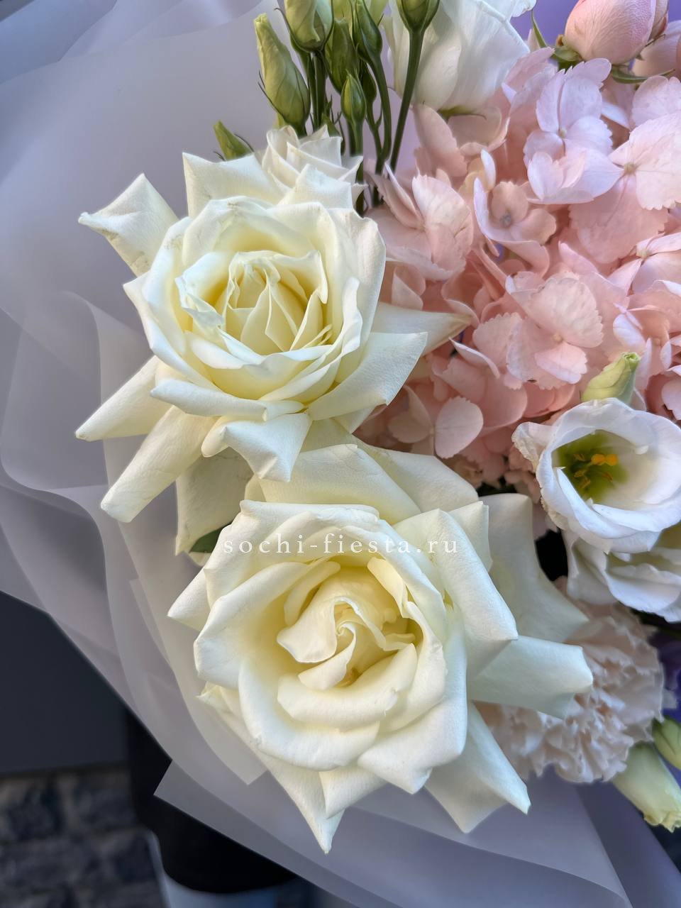 Белые розы и кустовая хризантема собраны в лаконичную форму. Светлая палитра и чистые линии букета подходят для любого повода и интерьера.