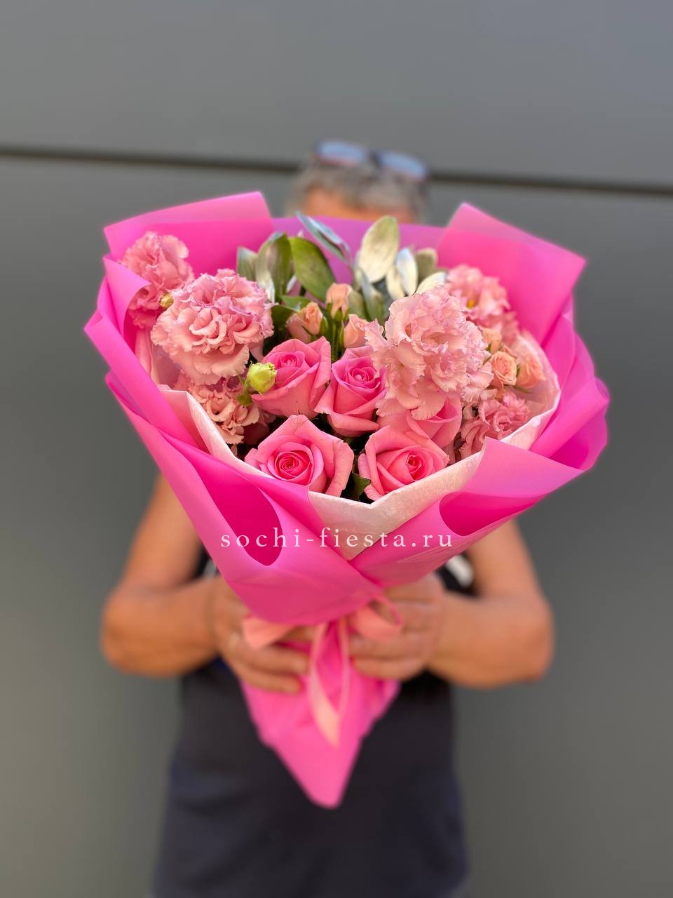 розовые розы, сирень, эвкалипт, лента, авторское оформление.
