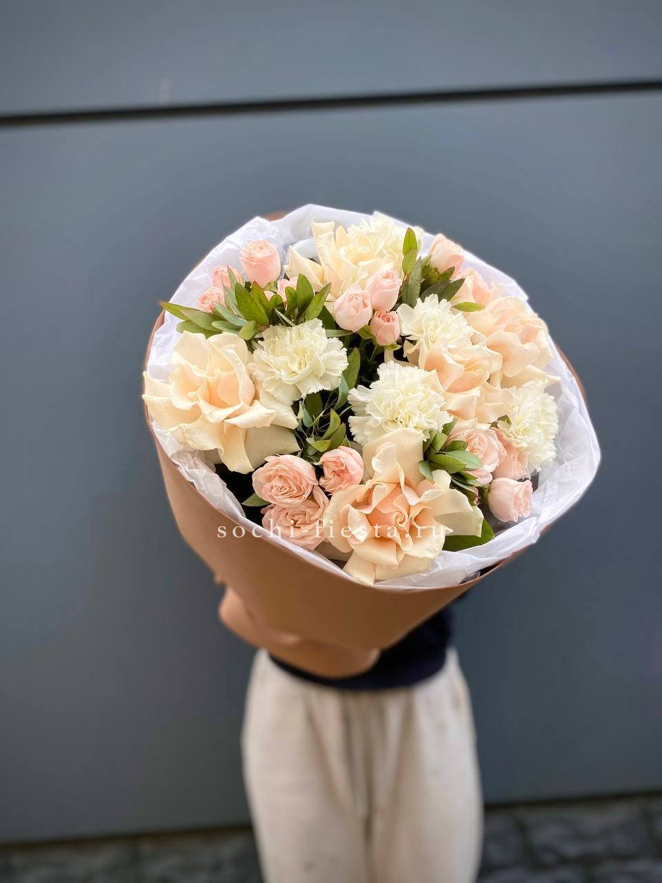 Кремовые и кустовые розы образуют спокойную цветовую гамму с тёплым подтоном. Диантусы добавляют объём, а эвкалипт вносит свежие нотки в общую картину.