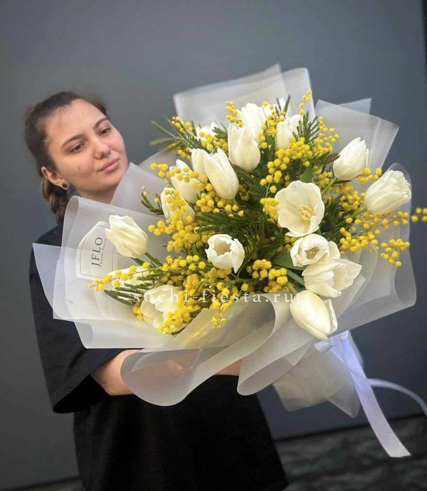 тюльпаны 25шт, мимоза, оформление.