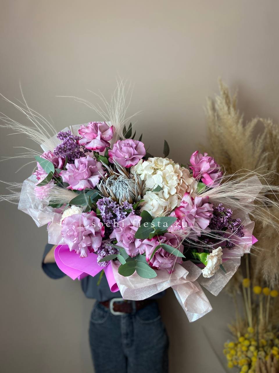 гортензия, сирень, французские розы, диантусы, протея, лента, дизайнерская упаковка.