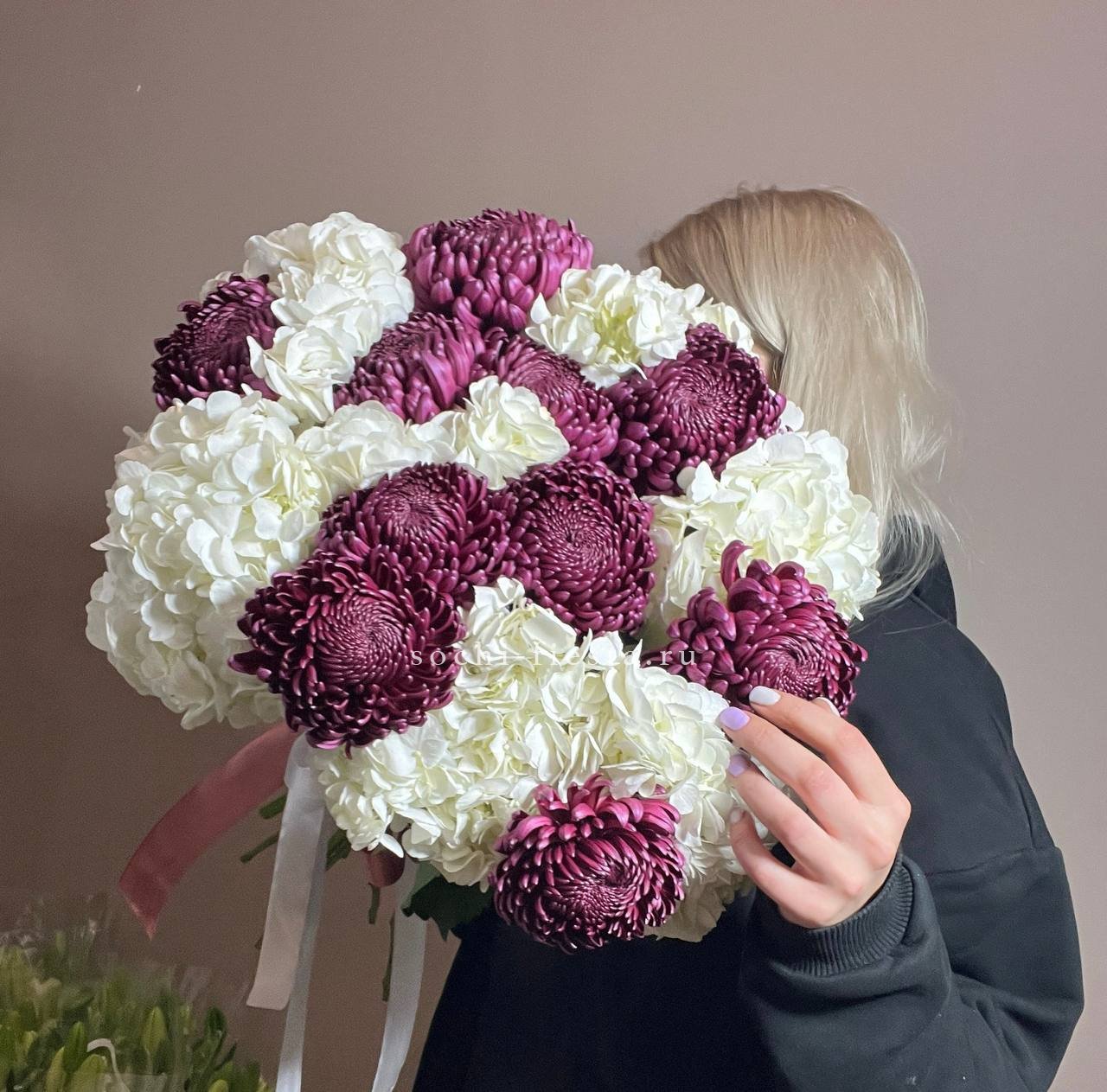 Белоснежные гортензии и розы Бигуди собраны в свободную охапку под атласную ленту. Щедрый объем и чистота линий создают ощущение легкости и простора.