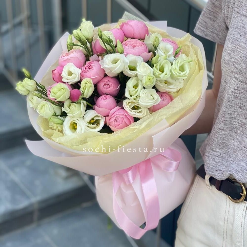 розовые розы, белые розы, диантус, бомбастик, гортензия, эвкалипт, пленка.