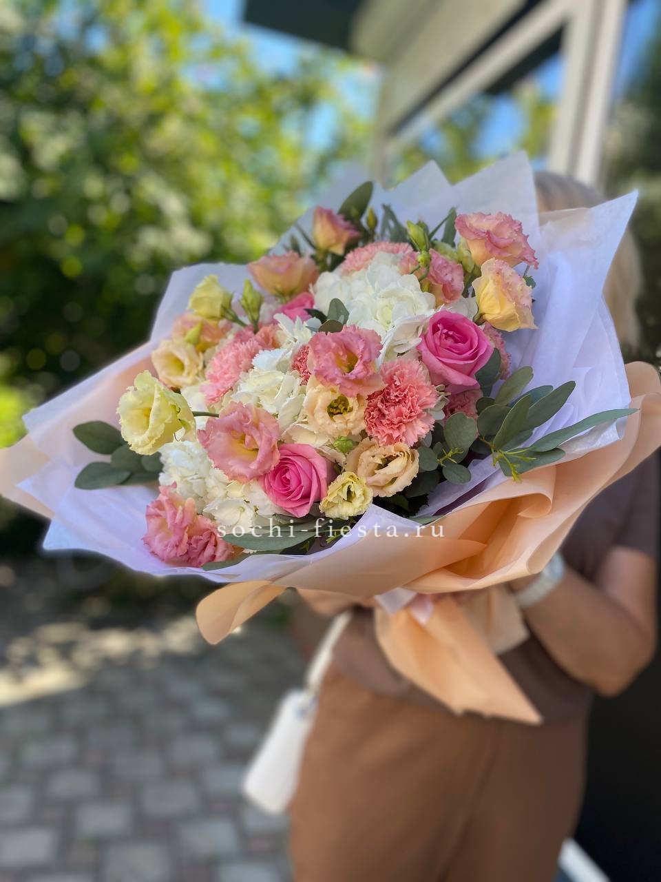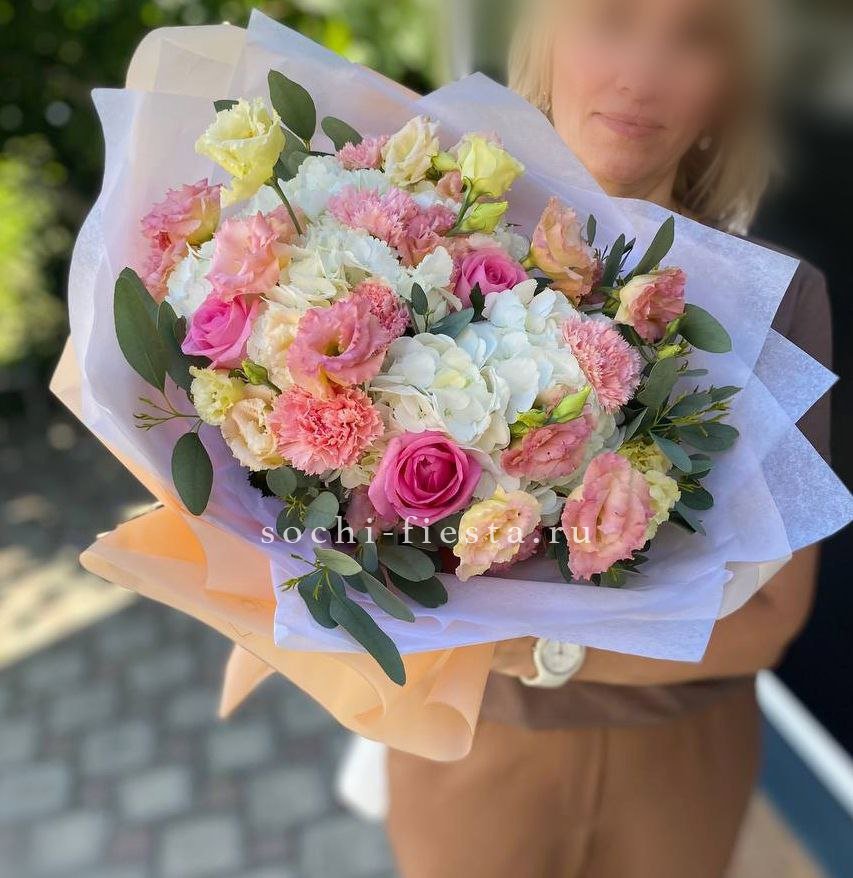 Пышная шапка из роз двух оттенков с объёмной гортензией и воздушным диантусом создаёт мягкий переход от белого к розовому. Бомбастик добавляет букету плотности, а эвкалипт освежает общую композицию. Универсальное решение для яркого поздравления.