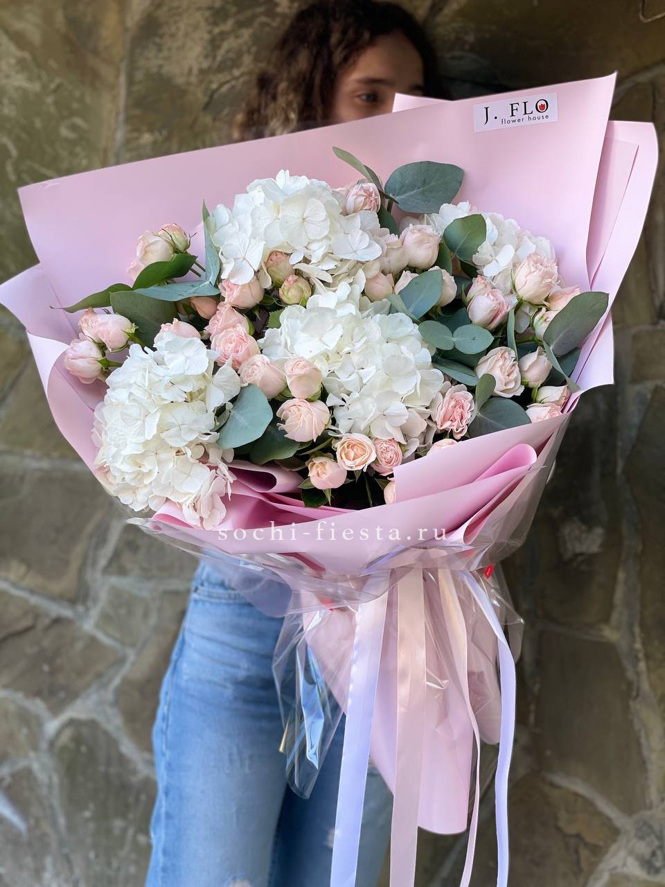 гортензия, эустома, диантус, эвкалипт, пленка.