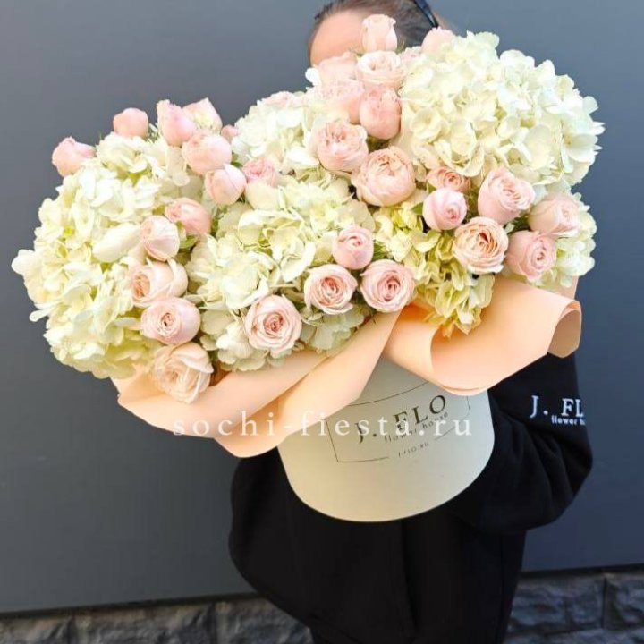 - Шляпная коробка с розами и гипсофилой — универсальный подарочный формат.