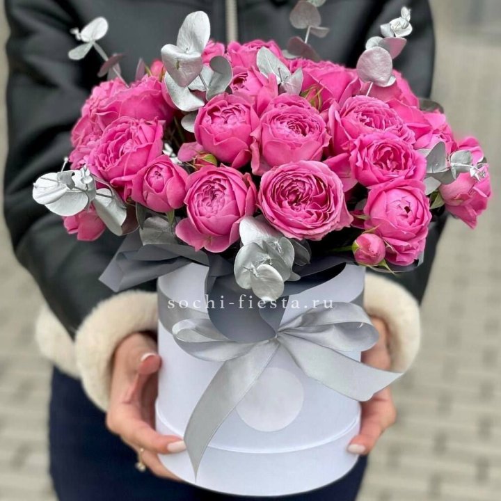 - Шляпная коробка с розами и гипсофилой — универсальный подарочный формат.